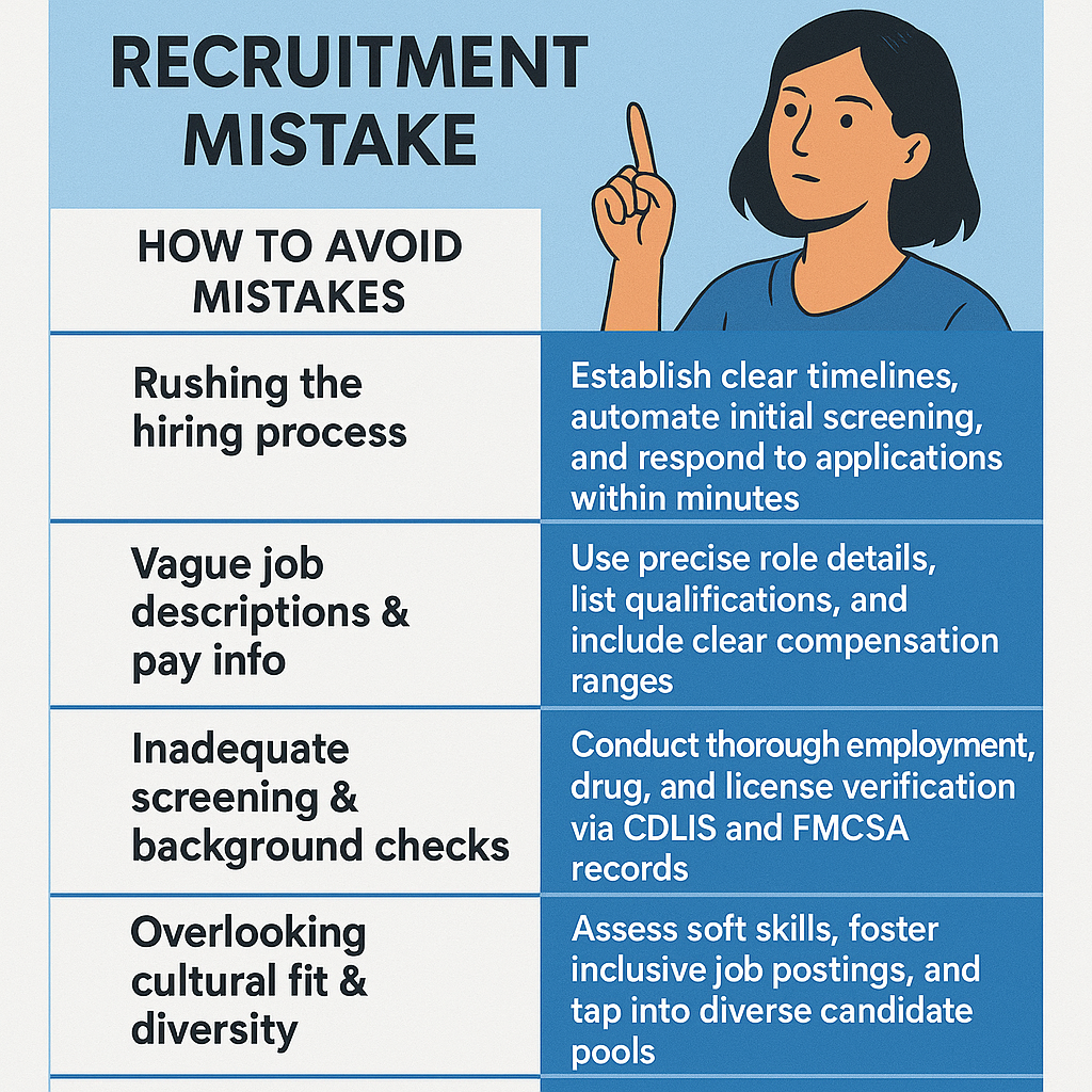 In the face of adversity, the logistics industry has become extremely competitive, and the importance of successful truck driver recruitment is at an all-time high. Despite this, a lot of the carriers keep stumbling over basic recruitment errors that waste their time, money, and credibility. The carriers in the market-opt between the small fleet and the enterprise level operator; the difference between a steady driver roster and constant turnover is the avoidance of these drawbacks. The following is a short reference chart, and then we look at the main five issues in‑depth with practical advice on how to avoid mistakes that derail hiring teams and repel suitable candidates.
